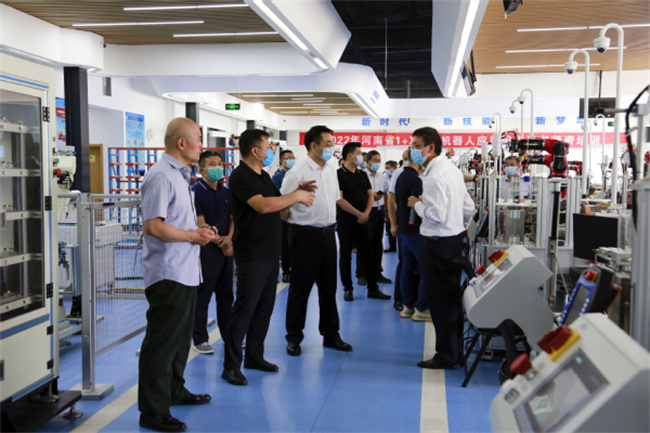 羅谷仁一行先后實地考察了校汽車綜合實訓(xùn)中心、工業(yè)機器人工程技術(shù)中心、虛擬現(xiàn)實工程技術(shù)中心、華為ICT學(xué)院產(chǎn)教融合實訓(xùn)基地、生命健康研究院等國家和省市教科研平臺,參觀了新校區(qū)規(guī)劃圖與綜合實訓(xùn)大樓效果圖。