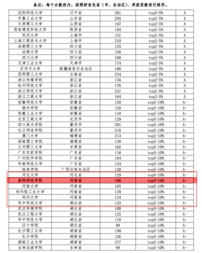 中新河南網(wǎng)9月8日電(杜志豪 師書魁) 日前,中國高等教育學會“高校競賽評估與管理體系研究”專家工作組對藝術(shù)類競賽指數(shù)進行分析發(fā)布。首輪藝術(shù)類競賽指數(shù)覆蓋的本科院校為1098所,南陽師范學院榮獲A-等級(綜合排名全國前5%-10%),在河南省高校中排名第一。