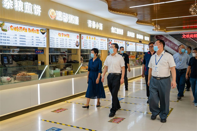 調(diào)研組一行深入學(xué)校西大門、茗羽餐廳、核酸檢測點(diǎn)等處,實(shí)地查看掃碼測溫、入校登記、按序就餐、感應(yīng)洗手、檢測點(diǎn)設(shè)置等工作。調(diào)研過程中,校領(lǐng)導(dǎo)從校園管控、重點(diǎn)人健康管理、錯(cuò)時(shí)錯(cuò)峰上課就餐等方面詳細(xì)匯報(bào)了學(xué)校疫情防控工作情況。調(diào)研組對我校秋季開學(xué)疫情防控各項(xiàng)工作給予了充分肯定,并對相關(guān)工作提出了建設(shè)性指導(dǎo)意見。
