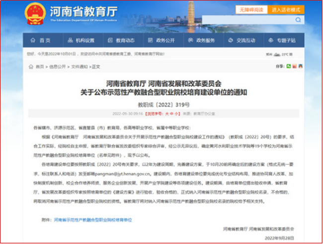 中新河南網(wǎng)10月13日電(李安杰) 近日,根據(jù)《河南省教育廳河南省發(fā)展和改革委員會(huì)關(guān)于開展示范性產(chǎn)教融合型職業(yè)院校建設(shè)工作的通知》(教職成〔2022〕20號(hào))的要求,省教育廳聯(lián)合省發(fā)改委組織專家綜合評(píng)審,經(jīng)公示無異議后,確定19個(gè)學(xué)校為河南省示范性產(chǎn)教融合型職業(yè)院校培育單位,鄭州電力高等?茖W(xué)校成功入選,為14所獲批示范性產(chǎn)教融合型高職院校培育單位之一。