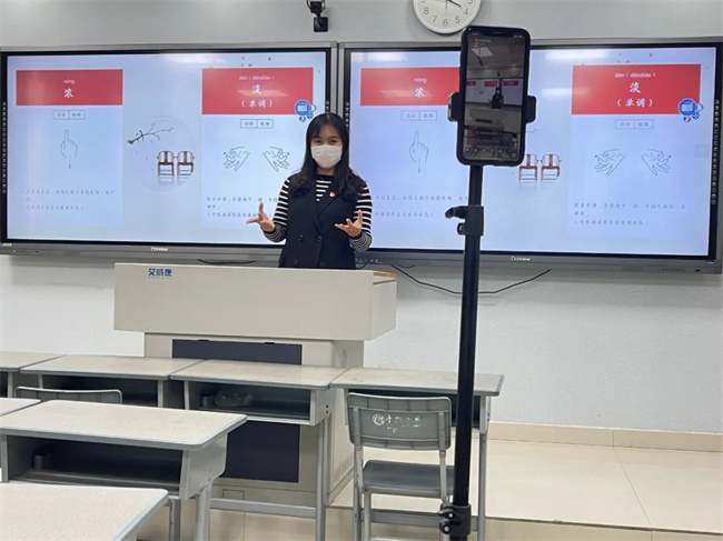 在校內(nèi)值班的陳潔書記在教室直播課程提升上課有效性和趣味性