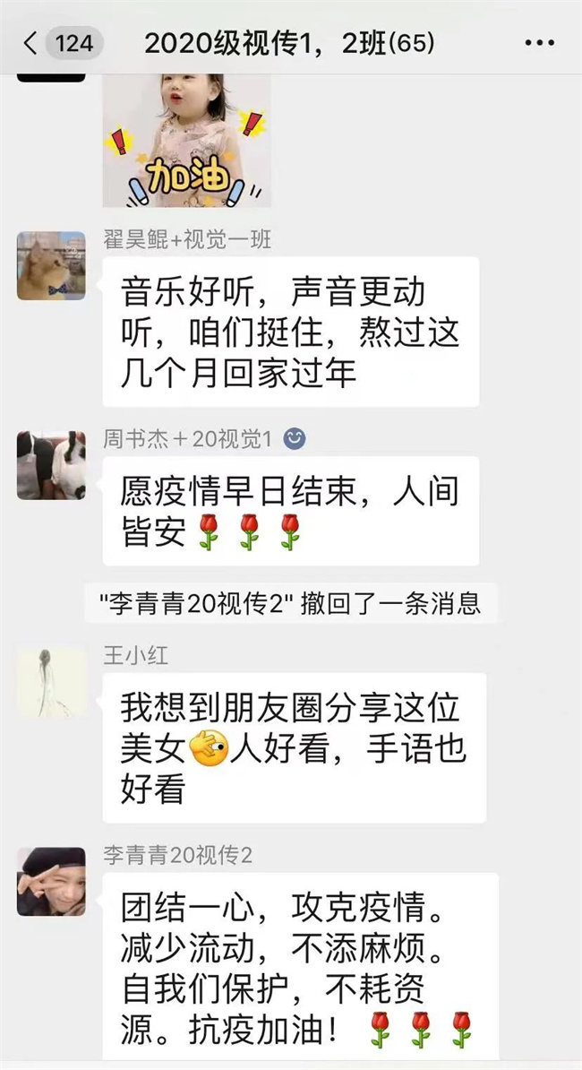 2021級視覺傳達設(shè)計1班吳雪同學(xué)表示,突如其來的疫情再次中斷了線下教學(xué),但在上網(wǎng)課期間依然能夠感受到老師們飽滿的熱情。學(xué)院領(lǐng)導(dǎo)和輔導(dǎo)員老師深入學(xué)生群體中,時刻關(guān)心著我們的生活狀態(tài)和心理健康,并給我們提出了疫情期間的自我防護要求和建議。在教學(xué)上,老師們一心為學(xué)生著想,每節(jié)課都精心準(zhǔn)備教學(xué)課件,還會給同學(xué)們推薦和學(xué)習(xí)有關(guān)的紀(jì)錄片。除此之外,能在宿舍里和聽人室友一起用手語交流,讓我感覺我們更像共同生活在溫馨小屋中的家人,大家一起努力共同進步。相信我們定會戰(zhàn)勝疫情,收獲成長!