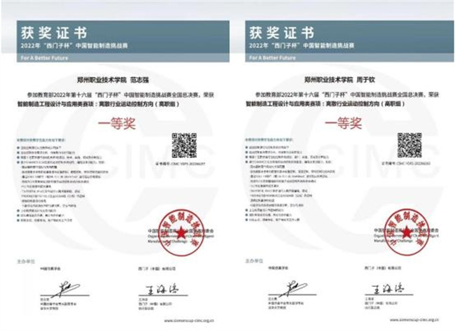 據(jù)了解,在9月29日,由教育部國際合作與交流司指導,中國仿真學會、西門子(中國)有限公司聯(lián)合主辦的教育部2022年第十六屆CIMC“西門子杯”中國智能制造挑戰(zhàn)賽全國總決賽落下帷幕。由鄭州職業(yè)技術學院智能制造學院姬耀鋒、盧青波聯(lián)合指導,學生周于欽、范志強組成的“森宇”團隊,充分發(fā)揚勇于拼搏的奮斗精神,精心準備,科學訓練,歷時三個月的艱辛備賽,最終不畏強手、沉著應戰(zhàn),憑借扎實的專業(yè)技能和良好的職業(yè)素養(yǎng),勇奪“離散行業(yè)運動控制方向”賽項全國總決賽一等獎。