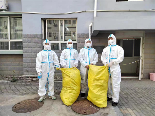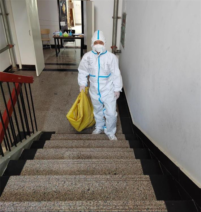 靠著這種必勝的信念,隊(duì)員們迎難而上,各項(xiàng)工作有序開(kāi)展。隊(duì)員們逐步接收安置60余名隔離人員,同時(shí)開(kāi)展分發(fā)物資、送餐、清理生活垃圾等工作。他們穿著密不透風(fēng)的防護(hù)服一次次步行穿梭在1樓至6樓之間,汗水浸透了衣服,腿腳已經(jīng)酸疼,也沒(méi)有停下服務(wù)的腳步。
