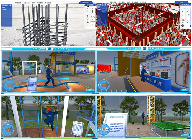 “四元融通”聯(lián)合開發(fā)理虛實一體化教學資源,以虛助實,突破難點。利用BIM技術(shù)虛實結(jié)合的特點,聯(lián)合河南建協(xié)、中建七局、中鐵二十局、河南天工、廊坊中科、廣州中望、北京廣聯(lián)達、西安三好等行業(yè)、企業(yè)、證書、競賽的相關(guān)方,開發(fā)崗課賽證“四元融通”特色的虛擬仿真教學資源。對接BIM基礎(chǔ)應(yīng)用、專項應(yīng)用、綜合管理等崗位群,基于真實工程項目、典型安全事故、復雜工序,開發(fā)《基礎(chǔ)工程施工》等理虛實一體的模塊化課程18門、方艙醫(yī)院等工程項目仿真33個、洞口墜落等安全事故仿真63個、異形屋面等復雜工序仿真782個,融入免共振微擾動沉樁等“建筑五新”85項,有效解決建筑實訓高風險、難再現(xiàn)、高消耗等痛點。同時,開發(fā)楊靖宇革命紀念館等紅色教育仿真資源34個、時光寶盒國寶文物等素質(zhì)教育仿真資源15個、云上鄒莊美麗鄉(xiāng)村等課程思政仿真資源45個,有效解決公共基礎(chǔ)課教學的應(yīng)用場景難實施、難觀摩、高投入等痛點。應(yīng)用BIM技術(shù)以虛助實,有景、有趣、有效、有用,突破理實一體化的難點,形成了理虛實一體的模塊化、系統(tǒng)化虛擬仿真實訓體系。