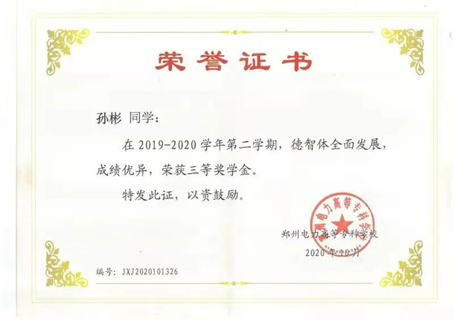 2019年,孫彬被錄取到鄭州電力高等?茖W校經(jīng)濟管理學院物流管理專業(yè)。他積極上進,勇于擔當,作為新時代的青年大學生,他立志成為能夠擔當民族復興大任的時代新人。在校期間,他在思想上始終嚴格要求自己,不斷加強自身的政治理論學習,擔任班級宣傳委員職務期間,他始終堅定正確的政治方向,擁護黨的各項方針政策,擁有創(chuàng)新精神,積極將自己的創(chuàng)新思想與同學和老師們分享。他說:“只有心中有信仰,才能知道自己腳下路的方向;只有心中有信念,才能無懼創(chuàng)新路上的荊棘坎坷。”
