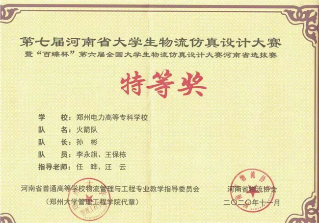 第七屆河南省大學生物流仿真設計大賽(團體賽)特等獎(排名第一)