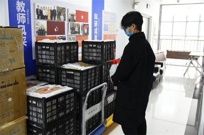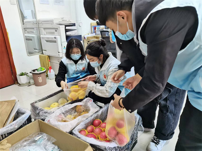 在經(jīng)過(guò)嚴(yán)格的消殺處理后,小金寶志愿者們對(duì)口罩和水果進(jìn)行分類(lèi)裝袋,及時(shí)送到在校師生和后勤保障工作人員手中,向更多工作人員傳遞溫暖與關(guān)愛(ài)。