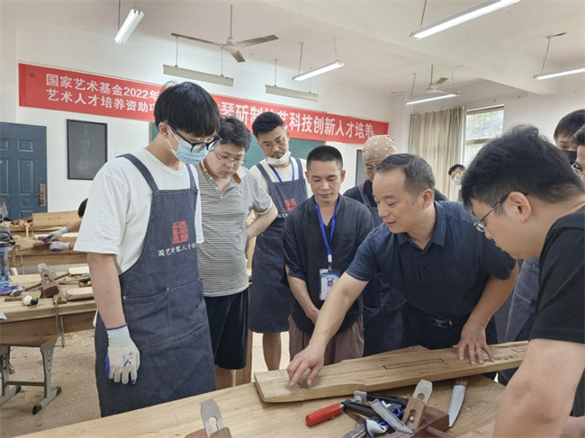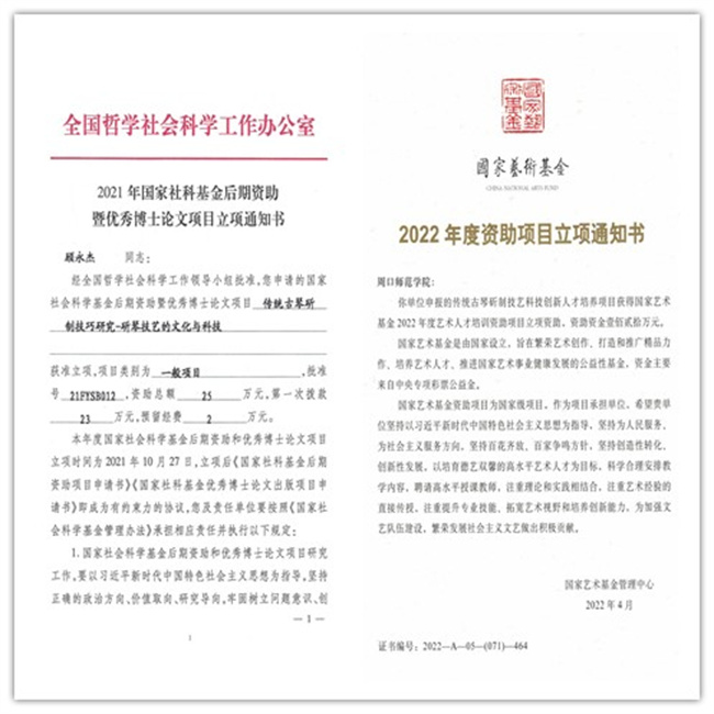 “凝練題目”“擴充內(nèi)容”“調(diào)整結(jié)構(gòu)”“精煉語言”“突出創(chuàng)新”……伴隨著一句句批判,顧永杰的課題本子猶如做琴一般,從初稿到定稿,反反復(fù)復(fù),修改打磨了不下50遍。良藥苦口能治病,忠言逆耳利于行,以顧永杰為負(fù)責(zé)人的課題組申報的《傳統(tǒng)古琴斫制技藝科技創(chuàng)新人才培養(yǎng)》,獲得國家藝術(shù)基金2022年度藝術(shù)人才培養(yǎng)項目立項,獲批經(jīng)費80萬元。