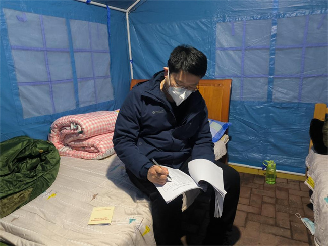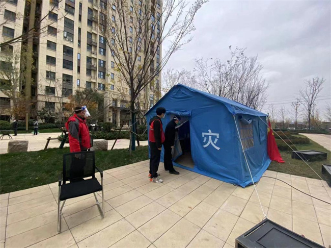 一把椅、一張床、一座帳篷、一個公示牌、一面黨旗……周圍的一切對于后勤處總務(wù)科科長易健同志而言陌生而又熟悉。來到經(jīng)開區(qū)京杭辦事處瑞之繡酒店公寓一線抗疫已經(jīng)五天了。每天24小時不間斷地巡查檢視,封控單元住戶數(shù)、人數(shù)、特殊群體等數(shù)據(jù)爛熟于心。然而,回想起幾天前在家里舒適的生活,眼前的一切又是那么陌生。