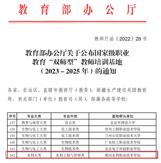 本次“雙師型”教師培訓(xùn)基地遴選是深入貫徹黨的二十大精神,落實(shí)中共中央辦公廳、國(guó)務(wù)院辦公廳印發(fā)的《關(guān)于推動(dòng)現(xiàn)代職業(yè)教育高質(zhì)量發(fā)展的意見(jiàn)》和《國(guó)務(wù)院關(guān)于印發(fā)國(guó)家職業(yè)教育改革實(shí)施方案的通知》要求,健全職業(yè)教育教師培訓(xùn)機(jī)制,優(yōu)化教師培訓(xùn)基地布局、推進(jìn)職普融通、產(chǎn)教融合、科教融匯的重要舉措;氐某晒Λ@批,是教育部對(duì)黃河水利職業(yè)技術(shù)學(xué)院綜合辦學(xué)實(shí)力的充分肯定。該校將以入選國(guó)家級(jí)職業(yè)教育“雙師型”教師培訓(xùn)基地為契機(jī),充分利用成員院校的師資力量和教學(xué)資源優(yōu)勢(shì)、成員企業(yè)的技術(shù)研發(fā)和實(shí)踐資源優(yōu)勢(shì),結(jié)合國(guó)家級(jí)職業(yè)教育教師教學(xué)創(chuàng)新團(tuán)隊(duì)培訓(xùn)基地、全國(guó)職業(yè)教育教師企業(yè)實(shí)踐基地,三基地協(xié)同發(fā)力,以服務(wù)經(jīng)濟(jì)社會(huì)發(fā)展、產(chǎn)業(yè)轉(zhuǎn)型升級(jí)和企業(yè)崗位高素質(zhì)技術(shù)技能人才需求為目標(biāo),提升教師的綜合能力和業(yè)務(wù)水平,引領(lǐng)職業(yè)院校教師、教材、教法“三教”改革,深化校企合作、校際協(xié)同,全面提升教師專(zhuān)業(yè)能力與思政能力并進(jìn),推進(jìn)教育理論支撐綜合教學(xué)能力,提升實(shí)踐操作水平,不斷加強(qiáng)高素質(zhì)“雙師型”教師隊(duì)伍建設(shè),為全面提高復(fù)合型技術(shù)技能人才培養(yǎng)質(zhì)量提供強(qiáng)有力的師資支撐,服務(wù)黃河流域生態(tài)保護(hù)和高質(zhì)量發(fā)展、南水北調(diào)后續(xù)工程高質(zhì)量發(fā)展等重大國(guó)家戰(zhàn)略,推動(dòng)新階段水利事業(yè)高質(zhì)量發(fā)展。