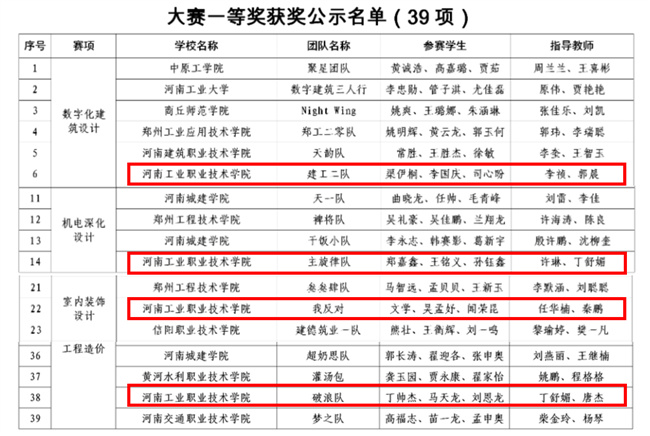 該校建筑工程學(xué)院參賽隊與眾多本科院校同臺競技,斬獲佳績,獲得數(shù)字化建筑設(shè)計一等獎1項、二等獎1項,機電深化設(shè)計一等獎1項,室內(nèi)裝飾設(shè)計一等獎1項、二等獎1項,工程造價一等獎1項、二等獎1項,工程管理二等獎2項,數(shù)字化結(jié)構(gòu)設(shè)計三等獎1項。同時,該校還獲得優(yōu)秀組織獎。