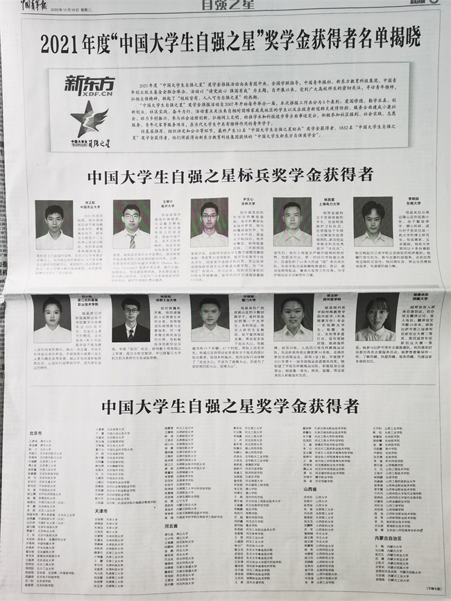 中新河南網(wǎng)12月13日電 近日,由共青團中央、全國學聯(lián)指導,中國青年報社、新東方教育科技集團、中國青年創(chuàng)業(yè)就業(yè)基金會聯(lián)合舉辦的2021年度“中國大學生自強之星”獎學金推報活動評審結(jié)果揭曉,全國范圍內(nèi)共評選出“中國大學生自強之星”獎學金獲得者1832名,經(jīng)學校推薦、省級初評、全國評審等環(huán)節(jié),河南信息統(tǒng)計職業(yè)學院會計學院2019級統(tǒng)計與會計核算專業(yè)的呂若源同學成功獲評“中國大學生自強之星”。