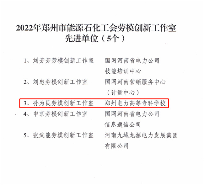 鄭州電力高等?茖W(xué)!皩O為民勞模創(chuàng)新工作室”獲批“鄭州市能源石化工會先進(jìn)勞模工作