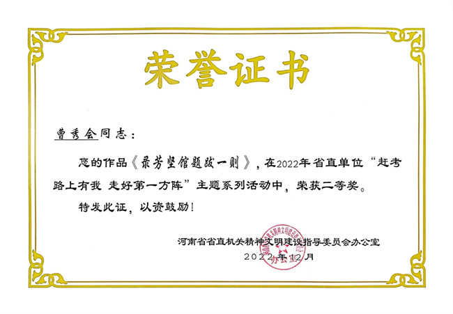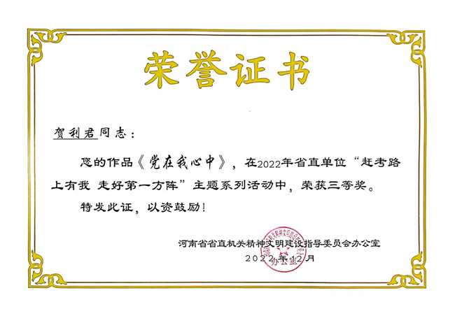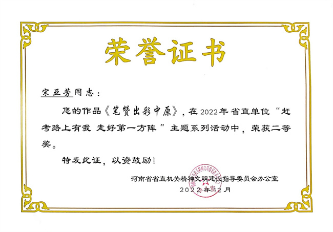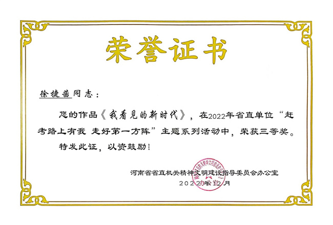 中新河南網(wǎng)3月1日電(鄭宇) 近日,省直文明辦印發(fā)《關(guān)于省直單位“趕考路上有我 走好第一方陣”主題系列活動的表揚通報》,鄭州電力高等專科學(xué)校報送的作品《錄芳堅館題跋一則》(曹秀會)獲書法類二等獎;《筆贊出彩中原》(宋亞芳)獲征文類二等獎;《我看見的新時代》(徐捷茜)、《黨在我心中》(賀利君)獲繪畫類三等獎。