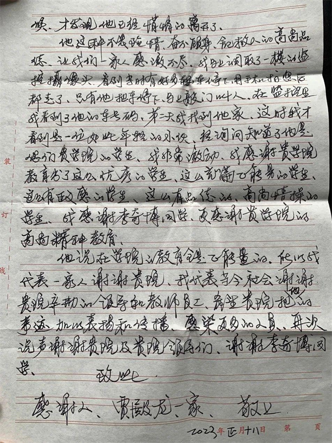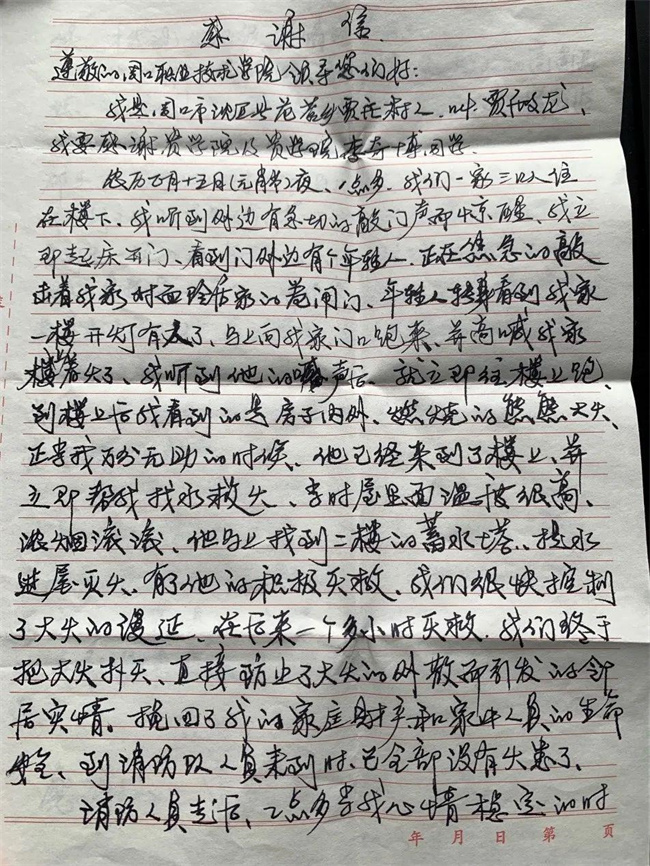 火越燒越旺,李奇博同學(xué)讓自己冷靜下來,首先將易燃易爆物品轉(zhuǎn)移,尋找身邊可以用的滅火工具,看到了二樓的蓄水罐,引水!李奇博同學(xué)急中生智,用二樓的蓄水罐,提水滅火,一趟又一趟地提水滅火。濃煙彌漫了所有人的眼和臉,大家還在奮力滅火,但火勢還是未能得到控制,慢慢的,呼吸的急促聲,咳嗽聲和劈劈啪啪的炙烤聲混成了一片,很是作響。但是李奇博和著火的那一家居民依舊沒有放棄,不停的撲火,提水,經(jīng)過長時(shí)間的奮戰(zhàn),幫賈殿龍一家撲滅了大火,之后就默默離開了。事后,賈殿龍一家通過各種途徑找到了李奇博同學(xué)表達(dá)謝意但是被他婉拒了,后來賈殿龍一家在鄰居口中得知李奇博同學(xué)是周口職業(yè)技術(shù)學(xué)院學(xué)生,并以寫感謝信的形式再次向?qū)W校、向李奇博同學(xué)表達(dá)感謝!