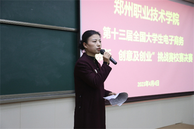 本次大賽邀請(qǐng)了學(xué)校招生就業(yè)服務(wù)中心主任蔡紅、電子商務(wù)學(xué)院書(shū)記張慧珠、電子商務(wù)學(xué)院院長(zhǎng)周文超、全球(鄭州)跨境電商研究院特聘教授張文勇、電子商務(wù)學(xué)院任方軍教授和楊中昭教授等人出席。同時(shí)邀請(qǐng)到了河南省高校雙創(chuàng)工作負(fù)責(zé)人楊馮圓教授、教育部?jī)?yōu)秀創(chuàng)新創(chuàng)業(yè)導(dǎo)師岳亮、天明集團(tuán)健康板塊副總經(jīng)理王杰和鄭州水工機(jī)械有限公司生產(chǎn)運(yùn)維部經(jīng)理韓錦鐸等校外專(zhuān)家蒞臨評(píng)審和指導(dǎo)。