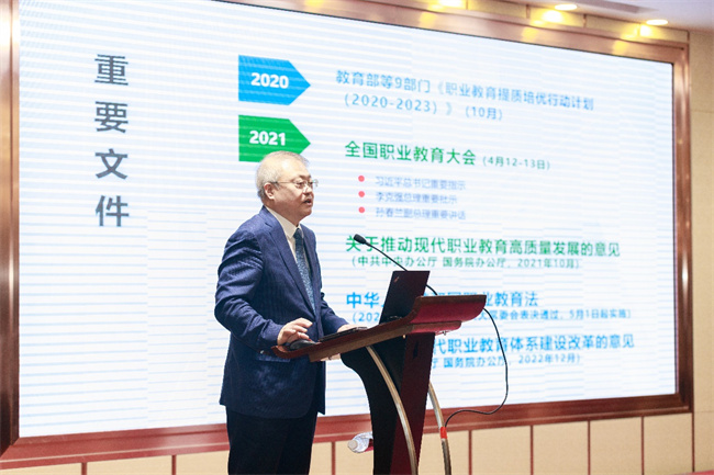 北京外國語大學(xué)教授、中國職業(yè)技術(shù)教育學(xué)會(huì)副會(huì)長孫善學(xué)以《當(dāng)前職業(yè)教育主要形勢與改革重點(diǎn)》為題作專題報(bào)告。他對當(dāng)前職業(yè)教育政策進(jìn)行深入透徹的講解,圍繞政治、經(jīng)濟(jì)、社會(huì)三個(gè)視角講述中國職業(yè)教育的格局之變,深刻題剖析新時(shí)代職業(yè)教育發(fā)展路徑及現(xiàn)狀,并從體系、體制、內(nèi)涵、技術(shù)、格局等五個(gè)方面指出當(dāng)前職業(yè)教育的發(fā)展重點(diǎn)。整場報(bào)告高屋建瓴、內(nèi)涵豐富,既有理論上的深刻感悟和獨(dú)到見解,又有對職業(yè)教育實(shí)踐的具體指導(dǎo)。
