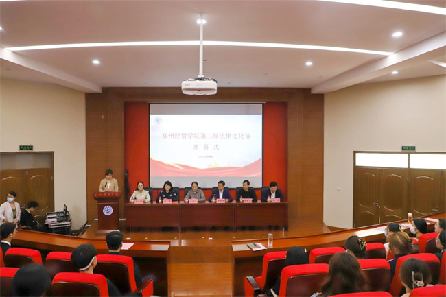 校長(zhǎng)助理?xiàng)畹旅飨蜞嵵萁?jīng)貿(mào)學(xué)院普法宣講團(tuán)團(tuán)長(zhǎng)授旗,并宣布鄭州經(jīng)貿(mào)學(xué)院第二屆法律文化節(jié)開(kāi)幕。
