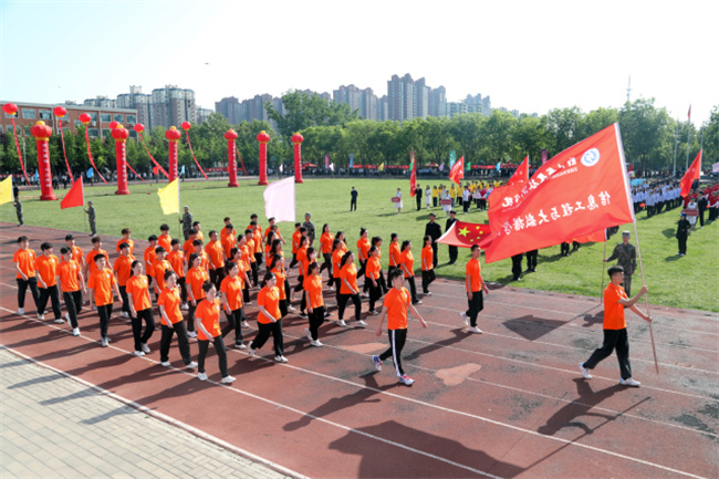 彩旗招展,呼號(hào)聲聲。伴隨著激昂奮進(jìn)的《運(yùn)動(dòng)員進(jìn)行曲》,國(guó)旗、校旗護(hù)旗隊(duì)邁著鏗鏘有力的步伐率先入場(chǎng),教職工方隊(duì)和各二級(jí)學(xué)院運(yùn)動(dòng)員方隊(duì)緊隨其后,他們英姿颯爽、整齊劃一,神采飛揚(yáng)、意氣風(fēng)發(fā),彰顯著該校師生蓬勃向上的精神風(fēng)貌。