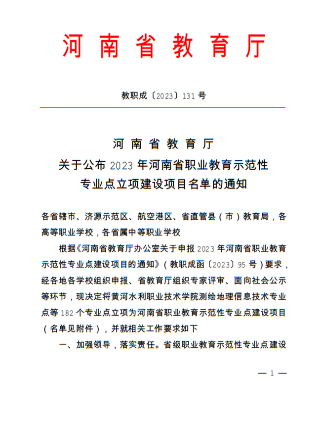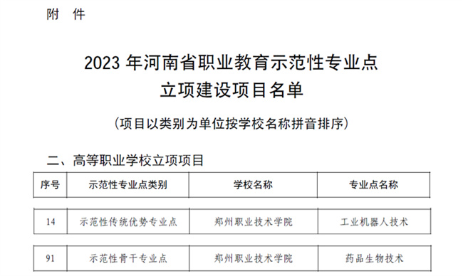中新河南網(wǎng)5月4日電(姬耀鋒) 近日,河南省教育廳發(fā)布了《關于公布 2023 年河南省職業(yè)教育示范性專業(yè)點立項建設項目名單的通知》(教職成〔2023〕131 號)文件,鄭州職業(yè)技術學院兩專業(yè)獲批河南省職業(yè)教育示范性專業(yè)點立項建設項目,其中 “工業(yè)機器人技術”專業(yè)為示范性傳統(tǒng)優(yōu)勢專業(yè)點,“藥品生產(chǎn)技術”專業(yè)為示范性骨干專業(yè)點。