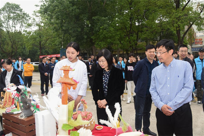 隨后,校領(lǐng)導(dǎo)實地參觀了學(xué)生勞動作品展示。智慧健康學(xué)院的“花色冷拼”、電子與物聯(lián)網(wǎng)學(xué)院的“電子管音響”、數(shù)字創(chuàng)意與設(shè)計學(xué)院的“國畫團(tuán)扇、版畫”、汽車與交通學(xué)院的車輛智能診斷平臺和音樂學(xué)院的“皮影戲”等各具專業(yè)特色的手工作品,吸引在場師生駐足觀看。
