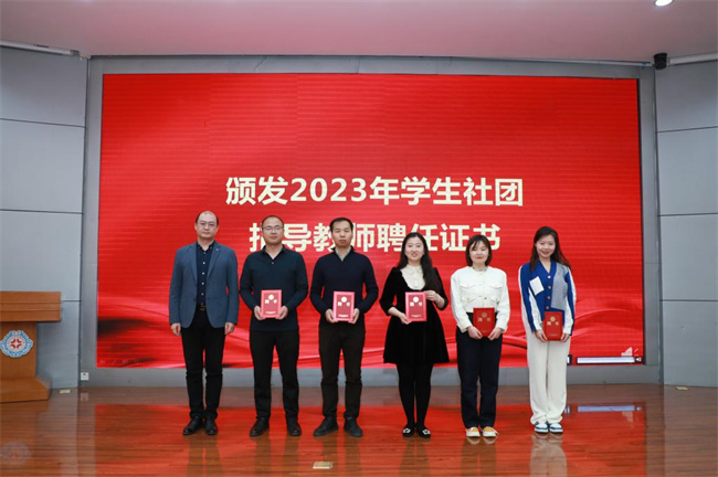 韋楊建宣布2023年學(xué)生社團(tuán)指導(dǎo)教師聘任名單并為新聘指導(dǎo)教師代表頒發(fā)聘書。