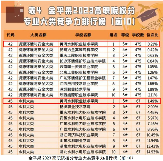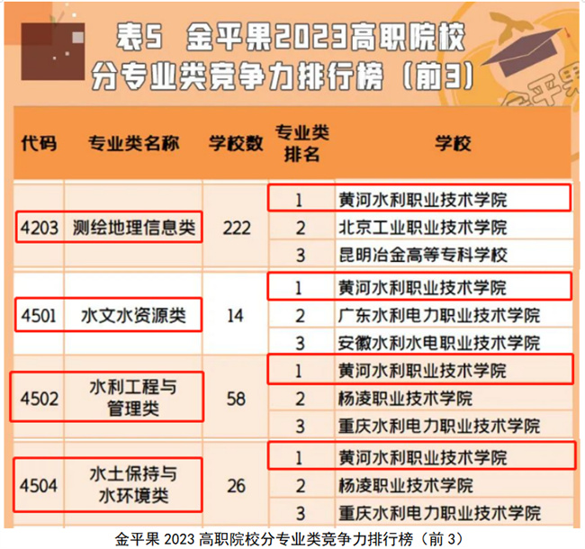 高職專(zhuān)業(yè)群綜合競(jìng)爭(zhēng)力評(píng)價(jià)數(shù)據(jù)顯示,該校水利水電建筑工程、測(cè)繪地理信息技術(shù)2個(gè)高水平專(zhuān)業(yè)群上榜;高職院校分專(zhuān)業(yè)大類(lèi)競(jìng)爭(zhēng)力排行榜顯示,該校資源環(huán)境與安全大類(lèi)、水利大類(lèi)2個(gè)分專(zhuān)業(yè)大類(lèi)位均列全國(guó)第一;高職院校分專(zhuān)業(yè)類(lèi)競(jìng)爭(zhēng)力排行榜顯示,該校測(cè)繪地理信息類(lèi)、水文水資源類(lèi)、水利工程與管理類(lèi)、水土保持與水環(huán)境類(lèi)4個(gè)專(zhuān)業(yè)類(lèi)均位列全國(guó)第一;高職院校專(zhuān)業(yè)競(jìng)爭(zhēng)力排行榜顯示,該校15個(gè)專(zhuān)業(yè)上榜,其中測(cè)繪地理信息技術(shù)、攝影測(cè)量與遙感技術(shù)、地籍測(cè)繪與土地管理、無(wú)人機(jī)測(cè)繪技術(shù)、水文與水資源技術(shù)、水利工程、智慧水利技術(shù)、水利水電建筑工程、水土保持技術(shù)9個(gè)專(zhuān)業(yè)位列全國(guó)第一,工程測(cè)量技術(shù)、測(cè)繪工程技術(shù)、水生態(tài)修復(fù)技術(shù)3個(gè)專(zhuān)業(yè)位列全國(guó)第二,生態(tài)環(huán)境修復(fù)技術(shù)、土木工程檢測(cè)技術(shù)、水利水電工程技術(shù)3個(gè)專(zhuān)業(yè)位列全國(guó)第三。