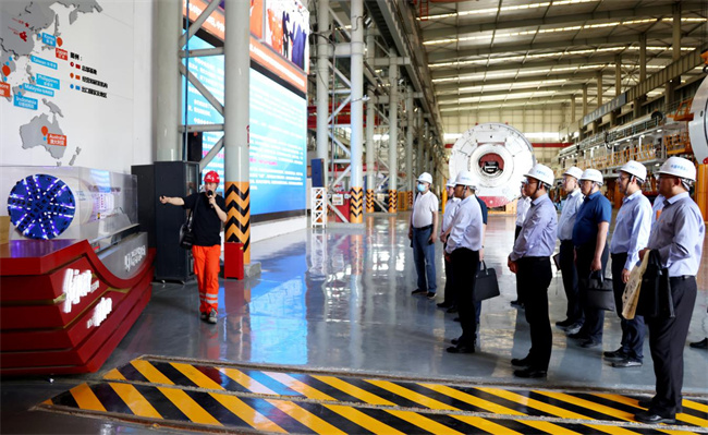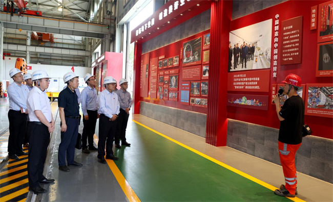 鄭州電專黨委書記楊義波一行首先走進參觀中鐵裝備盾構機總裝車間,直觀了解了隧道施工的四個階段、中鐵裝備跟跑、并跑、領跑的發(fā)展軌跡、企業(yè)實力,真切感受到中鐵裝備踐行“三個轉變”、推動創(chuàng)新發(fā)展的行業(yè)影響、品牌價值,震撼感動于中鐵裝備打造“掘進機第一品牌”、振興民族裝備制造業(yè)、加快建成世界一流地下工程裝備研發(fā)制造及綜合服務企業(yè)的光榮使命擔當。