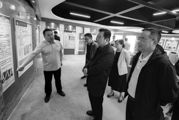 圖為平頂山市市場(chǎng)監(jiān)管局局長(zhǎng)孫國(guó)權(quán)(前排右二)、副局長(zhǎng)劉宏偉(前排右一)在河南質(zhì)量工程職業(yè)學(xué)院質(zhì)量文化館參觀。