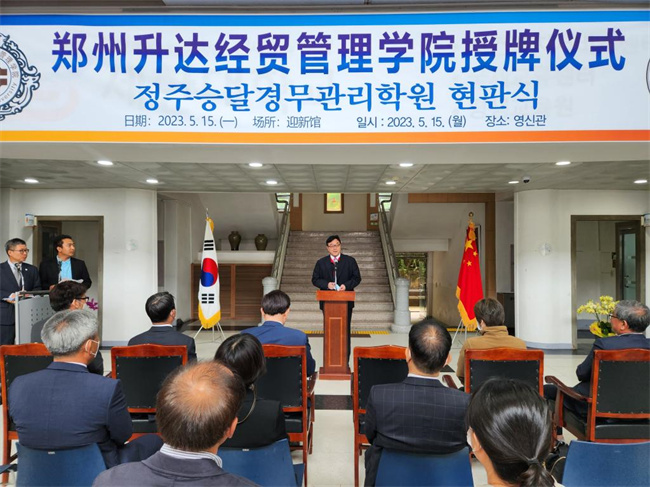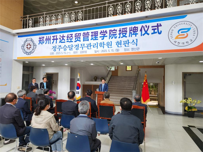 揭牌儀式上,雙方領(lǐng)導(dǎo)及參會(huì)人員共同為世翰大學(xué)升達(dá)分院揭牌,學(xué)校執(zhí)行董事王新奇、韓國世翰大學(xué)校長李昇勛分別致辭,與會(huì)雙方還就相關(guān)工作進(jìn)行交流討論。