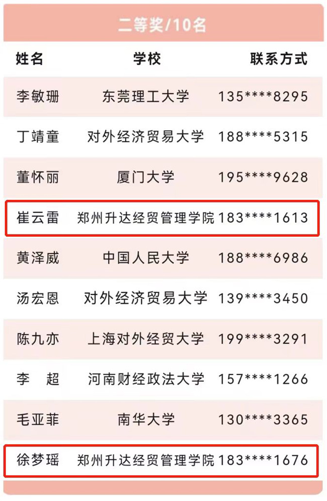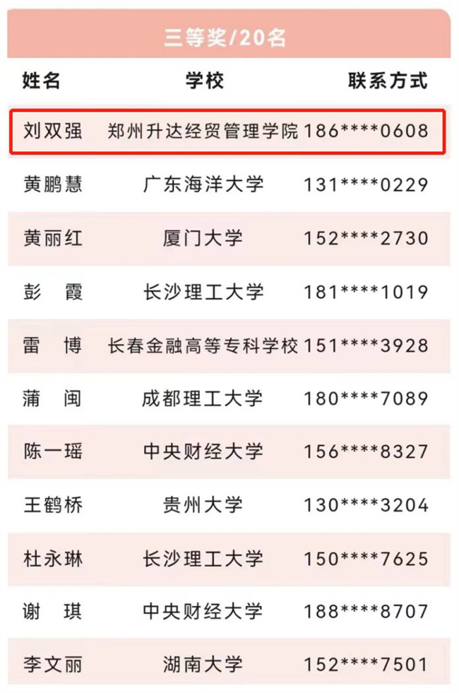 鄭州升達(dá)經(jīng)貿(mào)管理學(xué)院金融工程、金融學(xué)專業(yè)學(xué)生在徐云燕、蔡艷兩位指導(dǎo)老師的帶領(lǐng)下,與來自中國人民大學(xué)、廈門大學(xué)、中央財(cái)經(jīng)大學(xué)等120余所高校,1500余名學(xué)生同場(chǎng)競(jìng)技。最終,來自20金工2班的崔云雷、20金工1班的徐夢(mèng)瑤榮獲二等獎(jiǎng),20金工2班的劉雙強(qiáng)獲三等獎(jiǎng)。