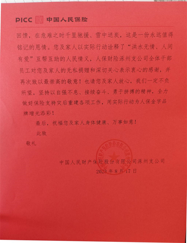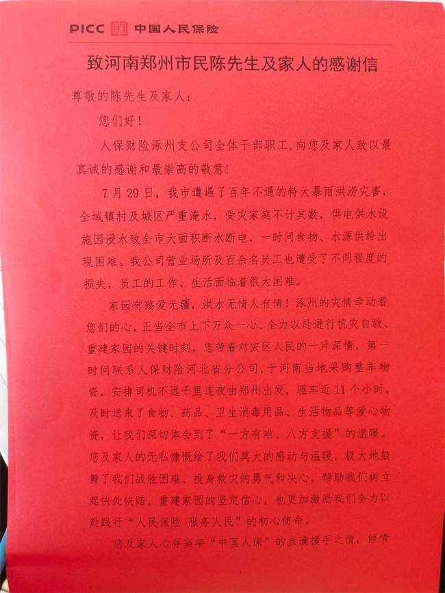 為什么要去兩次?他說,作為曾被困水中幾天幾夜的親歷者,他對曾向自己伸出援手的河北人保充滿感激。“在2021年鄭州‘7.20’特大暴雨的時(shí)候,一個(gè)人被困在家里,斷水?dāng)嚯,手機(jī)沒信號,當(dāng)時(shí)整個(gè)人是很絕望的,你不知道下一刻等待你的是什么。”就是在這種情況下,河北人保的救援電話竟然聯(lián)系上了他。“他們詢問我的身體狀況,了解我的食物儲(chǔ)備及人身安全,更難得的是他們告訴我信號斷了之后還會(huì)不斷聯(lián)系我,讓我一下子覺得有盼頭了。”因?yàn)槭謾C(jī)沒信號,他無法與外界取得聯(lián)系,接下來的幾天,這個(gè)救援電話時(shí)不時(shí)打進(jìn)來,讓他覺得溫暖不再孤單。“直到洪水退去,他們一直與我保持聯(lián)系,并來到現(xiàn)場為我提供幫助。”正是2021年那場河北人保的救援,讓陳佳在知道河北暴雨水災(zāi)后的第一個(gè)念頭就是“我必須做點(diǎn)什么!”第一次是在旅游途中,事發(fā)突然,送的物資也是匆忙準(zhǔn)備的,總覺得沒有盡全力,心有遺憾,女兒的一句“那就再去一次唄”,讓他開始了第二次行動(dòng)!這不止是一個(gè)知恩圖報(bào)的故事,也是一場大愛的傳遞和延續(xù)......