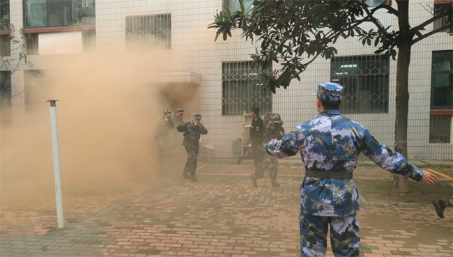 隨后,學校組織開展了應(yīng)急疏散逃生演練,演練假設(shè)學校宿舍樓發(fā)生火災,學校迅速啟動應(yīng)急預案,各值班崗位迅速到位,緊急通知學生疏散逃生,同學們從學生宿舍安全出口有序疏散逃生。疏散中,同學們用濕毛巾捂住口鼻,彎腰低姿快速撤離到運動場,整個疏散過程安全有序、快速高效。在清點人員時發(fā)現(xiàn)二公寓2218宿舍一名男生被困宿舍未能安全撤離,隨后消防車趕到,開始滅火救援,最后被困人員被安全救出。