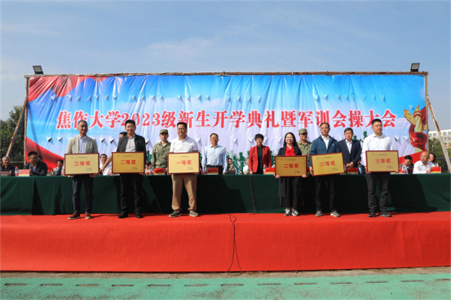 隨后,新生代表、在校生代表、教師代表先后發(fā)言。校黨委委員、副校長劉際平宣讀了《焦作大學(xué)關(guān)于表彰2023級軍訓(xùn)工作先進集體、先進個人的決定》。校領(lǐng)導(dǎo)和部隊首長為軍訓(xùn)工作先進集體、優(yōu)秀教官、優(yōu)秀指導(dǎo)員代表頒獎,山陽區(qū)武裝部部長黃應(yīng)龍作了講話。