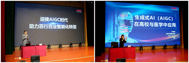 會上,邀請了新華三集團數(shù)字中國研究院副院長任沛杰、教育信息化解決方案專家盧海燕作教育信息化專題輔導報告。任沛杰作題為《AIGC基礎知識與發(fā)展介紹》的報告,圍繞“AIGC技術發(fā)展趨勢”“AIGC解決方案助力智能化轉型”“算力基礎設施助力大模型商用落地”“AIGC實踐”等四個方面,講解了AIGC的起源以及當前各行業(yè)熱點應用。盧海燕作題為《生成式AI(AIGC)在高校與醫(yī)學中應用》的報告,從“H3C大模型歷程”“生成式AI高校應用場景”“生成式AI醫(yī)學醫(yī)療應用”“私域大模型必要性”等四個方面介紹大模型在醫(yī)學高校人才培養(yǎng)、教學、科研、管理服務等領域的應用。
