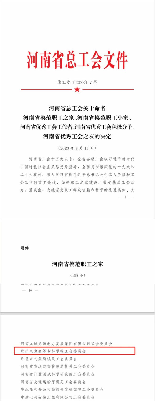 中新河南網(wǎng)10月25日電(阿依古麗·艾力江) 日前,河南省總工會下發(fā)《關(guān)于命名河南省模范職工之家、河南省模范職工小家、河南省優(yōu)秀工會工作者、河南省優(yōu)秀工會積極分子、河南省優(yōu)秀工會之友的決定》(豫工發(fā)〔2023〕7號),鄭州電力高等?茖W(xué)校工會被河南省總工會授予“河南省模范職工之家”榮譽稱號。