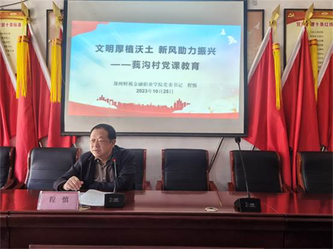 首先,黨委書記程慎以《文明厚植沃土 新風(fēng)助力振興》為題,為“村兩委”、駐村工作隊(duì)和黨員代表上專題黨課。程慎從學(xué)院的基本情況、深刻領(lǐng)悟主題教育的重大意義、駐村主要職責(zé)任務(wù)和助力鄉(xiāng)村振興四方面上了一堂生動鮮活、飽滿翔實(shí)的黨課。他指出,職業(yè)教育賦能鄉(xiāng)村振興有助于融合城鄉(xiāng)發(fā)展,實(shí)現(xiàn)共同富裕的目標(biāo),積極探索“高校+鄉(xiāng)村”的育人模式。一要強(qiáng)化黨建引領(lǐng),激活發(fā)展“新引擎”;二要加強(qiáng)頂層設(shè)計(jì),促進(jìn)校地協(xié)同;三要握緊科技助農(nóng)“方向盤”,激活鄉(xiāng)村振興“動力源”;四要發(fā)揮“人才助農(nóng)”的教育功能,組建技術(shù)服務(wù)團(tuán)隊(duì);五要傳承創(chuàng)新,提升鄉(xiāng)村振興文化精氣神。