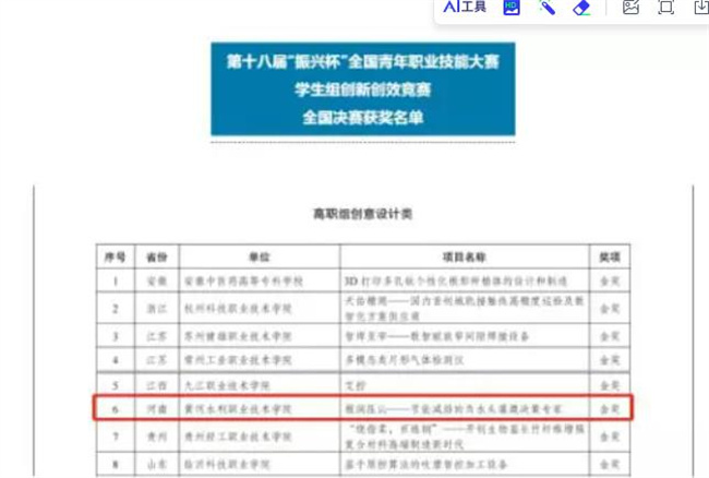 中新河南網(wǎng)11月17日電 11月10日至11日,第十八屆“振興杯”全國青年職業(yè)技能大賽學(xué)生組創(chuàng)新創(chuàng)效競(jìng)賽全國決賽在河南鄭州舉行落下帷幕。黃河水利職業(yè)技術(shù)學(xué)院水利工程學(xué)院項(xiàng)目《根潤(rùn)壓沁——節(jié)能減排的負(fù)水頭灌溉決策專家》榮獲高職組創(chuàng)意設(shè)計(jì)類全國金獎(jiǎng)。這是黃河水院首次在該項(xiàng)賽事中榮獲全國金獎(jiǎng),實(shí)現(xiàn)了新突破。