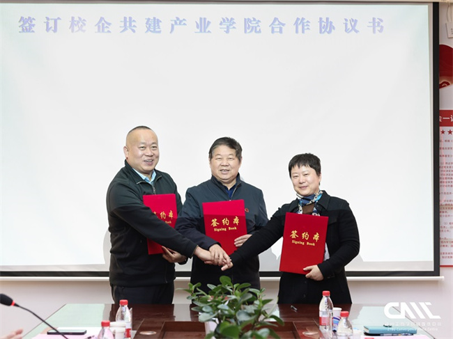 郭德欣、劉瑩、張林峰共同簽署共建智能制造產(chǎn)業(yè)學(xué)院合作協(xié)議書,并為智能制造產(chǎn)業(yè)學(xué)院揭牌。秦方奇分別為劉瑩和張林峰頒發(fā)客座教授聘書。