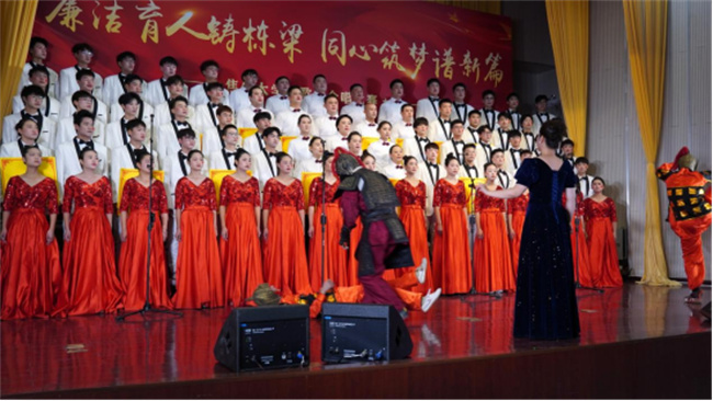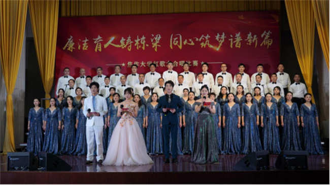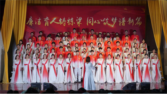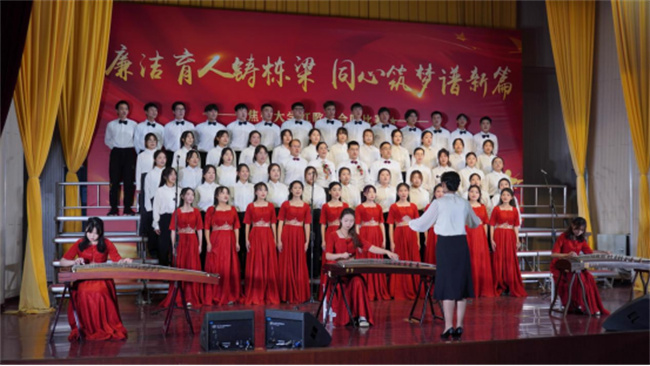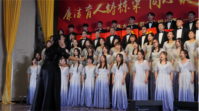 舞臺(tái)上,來(lái)自全校各單位的10支參賽隊(duì)和2支表演隊(duì)高唱紅歌,深情禮贊偉大的黨和祖國(guó)。各合唱隊(duì)精心籌備,用合唱、舞蹈、朗誦、武術(shù)等多種形式生動(dòng)演繹了一堂傳承紅色經(jīng)典、汲取精神力量的“音樂(lè)思政課”。演出現(xiàn)場(chǎng)高潮迭起,掌聲不斷,精彩演出帶領(lǐng)觀眾追憶篳路藍(lán)縷,回顧崢嶸歲月,真切感受中國(guó)共產(chǎn)黨百年奮斗歷程的光輝燦爛,感受中國(guó)共產(chǎn)黨為人民服務(wù)的不變初心,感受中國(guó)共產(chǎn)黨奮進(jìn)新時(shí)代的磅礴力量,進(jìn)一步增強(qiáng)了對(duì)馬克思主義、共產(chǎn)主義的信仰,增強(qiáng)了對(duì)實(shí)現(xiàn)中華民族偉大復(fù)興的信心。
