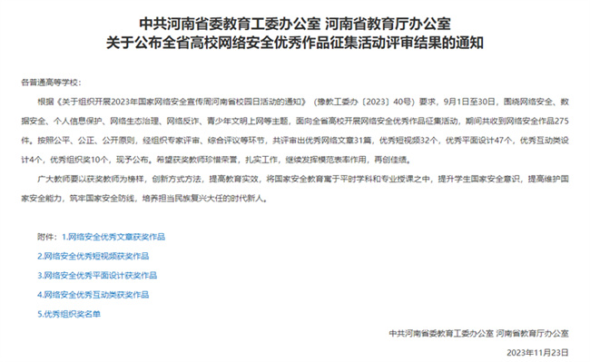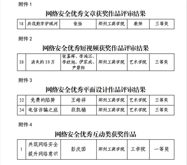 中新河南網(wǎng)11月28日電(袁曉鵬) 近日,中共河南省委教育工委辦公室 河南省教育廳辦公室發(fā)布《關(guān)于公布全省高校網(wǎng)絡(luò)安全優(yōu)秀作品征集活動(dòng)評(píng)審結(jié)果的通知》,經(jīng)組織專家評(píng)審、綜合評(píng)議等環(huán)節(jié),鄭州工商學(xué)院彭慶國同學(xué)制作的網(wǎng)絡(luò)安全互動(dòng)類作品《共筑網(wǎng)絡(luò)安全 提升網(wǎng)絡(luò)意識(shí)》榮獲一等獎(jiǎng);王皓祥同學(xué)的平面設(shè)計(jì)作品《免費(fèi)的陷阱》榮獲二等獎(jiǎng),肖自怡同學(xué)的平面設(shè)計(jì)作品《你真的“安全”嗎?》榮獲三等獎(jiǎng);教師張揚(yáng)的文章作品《共筑數(shù)字護(hù)城河》以及藝術(shù)學(xué)院選報(bào)的短視頻作品《消失的二十萬》分別榮獲文章類和短視頻類三等獎(jiǎng)。學(xué)校積極響應(yīng)活動(dòng),精心組織,獲得“優(yōu)秀組織獎(jiǎng)”。