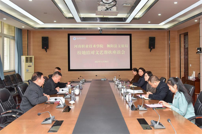 中新河南網(wǎng)12月2日電 (郭爽) 11月30日上午,舞陽(yáng)縣文化廣電和旅游局書(shū)記、局長(zhǎng)丁永旗帶領(lǐng)縣文化館、賈湖曲劇團(tuán)負(fù)責(zé)人,到河南職業(yè)技術(shù)學(xué)院對(duì)接文藝幫扶工作。學(xué)校黨委宣傳部部長(zhǎng)楊華及音樂(lè)學(xué)院、文化旅游學(xué)院相關(guān)負(fù)責(zé)同志接待了來(lái)訪人員,并與他們就校地文藝幫扶工作舉行了深入地交流座談。