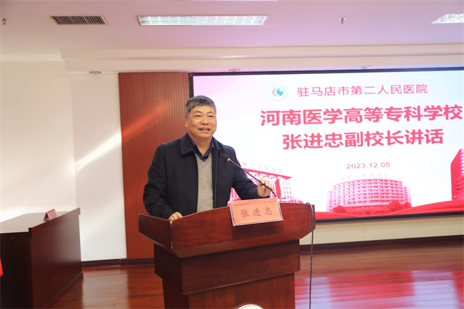 張進(jìn)忠首先對教學(xué)醫(yī)院簽約表示祝賀,對駐馬店市第二人民醫(yī)院長期以來對學(xué)校實習(xí)工作的支持表示感謝。并介紹了學(xué)校的建設(shè)發(fā)展歷程和近年來在教育教學(xué)改革中取得的突出成績,簡要解讀了職教改革的有關(guān)政策和開展校企合作、產(chǎn)教融合的重要意義。他指出,職業(yè)教育作為一種類型教育,校企合作、產(chǎn)教融合是其辦學(xué)模式,“校”“院”合作是高水平培養(yǎng)醫(yī)藥衛(wèi)生人才的重要保證,是推動醫(yī)學(xué)教育創(chuàng)新發(fā)展的重要舉措。教學(xué)醫(yī)院簽約掛牌,將開啟我們“醫(yī)、教、研”合作的新局面,學(xué)校將向醫(yī)院的全體專業(yè)技術(shù)人員,開放圖書館、學(xué)報、科研實驗中心、教科研項目申報等教科研資源,共同推動校、院發(fā)展。駐馬店市第二人民醫(yī)院,作為國家精神心理疾病臨床醫(yī)學(xué)研究中心豫南分中心,學(xué)科體系完善,專業(yè)特色突出,臨床綜合支撐力強(qiáng),我們的合作,也一定能為心理咨詢專業(yè)的建設(shè)和發(fā)展提供更強(qiáng)的保障,培養(yǎng)更多優(yōu)秀的醫(yī)學(xué)人才,共同為推動醫(yī)療衛(wèi)生事業(yè)的發(fā)展貢獻(xiàn)力量。