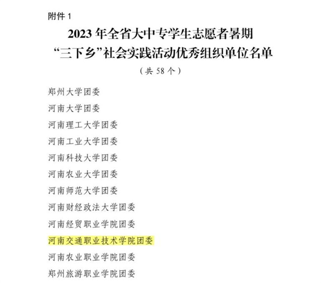 中新河南網(wǎng)12月25日電(米粒兒) 近日,河南省委宣傳部、共青團(tuán)河南省委、河南省教育廳、河南省學(xué)生聯(lián)合會聯(lián)合印發(fā)《關(guān)于2023年全省大中專學(xué)生志愿者暑期文化科技衛(wèi)生“三下鄉(xiāng)”社會實(shí)踐活動的通報》,決定對在2023年“三下鄉(xiāng)”社會實(shí)踐活動中表現(xiàn)突出的優(yōu)秀集體、個人和項(xiàng)目進(jìn)行通報表揚(yáng)。河南交通職業(yè)技術(shù)學(xué)院團(tuán)委被評為2023年全省暑期“三下鄉(xiāng)”社會實(shí)踐活動優(yōu)秀單位;公路學(xué)院“河南交通職業(yè)技術(shù)學(xué)院公路學(xué)院愛之路志愿服務(wù)隊(duì)實(shí)踐團(tuán)”被評為2023年全省暑期“三下鄉(xiāng)”社會實(shí)踐活動優(yōu)秀團(tuán)隊(duì);公路學(xué)院程芳老師被評為2023年全省暑期“三下鄉(xiāng)”社會實(shí)踐活動優(yōu)秀個人。