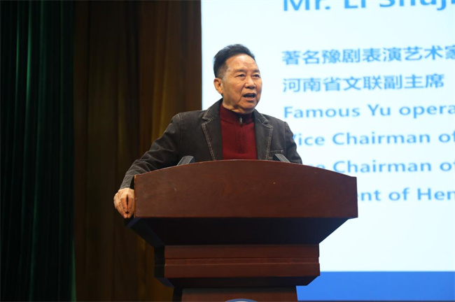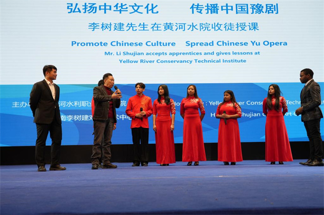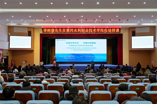 在豫劇展演環(huán)節(jié),6名留學生代表上臺表演豫劇《花木蘭》(選段)。李樹建親傳弟子劉子杰主持拜師儀式,6名留學生崇拜中華優(yōu)秀的傳統(tǒng)文化,正式成為李派外籍弟子。豫劇授課環(huán)節(jié),李樹建先生以其深厚的表演功底、激情滿懷的教學態(tài)度和幽默詼諧的語言,以及具有專業(yè)水準的聲樂表演,向在場師生展現了戲曲表演的神韻和魅力,并親自傳授了戲曲唱腔的發(fā)聲技巧,引導學生們參與到戲曲表演中,并開展現場互動;顒咏Y束后留學生們意猶未盡,紛紛表示希望通過更多類似文化交流活動感受豫劇魅力、感知中華文化。