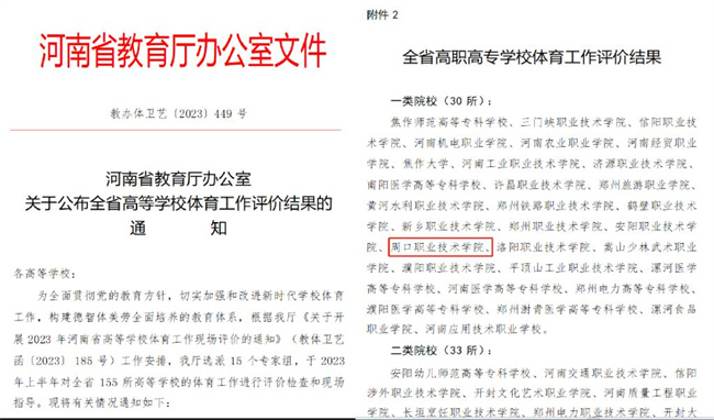 中新河南網(wǎng)1月9日電 近日,河南省教育廳下發(fā)《關(guān)于公布全省高等學校體育工作評價結(jié)果的通知》(教辦體衛(wèi)藝〔2023〕449號),周口職業(yè)技術(shù)學院從全省155所高等學校中脫穎而出,被評為2023年河南省高職高專學校體育工作一類院校。
