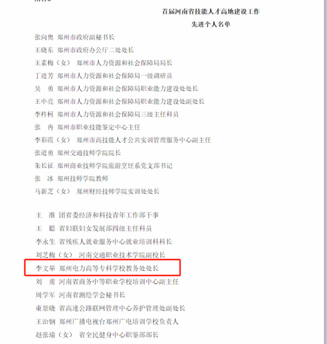 鄭州電力高等專科學(xué)校教師獲得首屆河南省技能人才高地建設(shè)工作先進(jìn)個(gè)人表彰