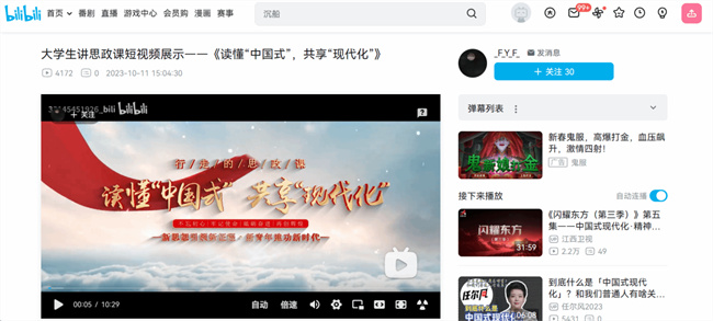接到賽事通知之后,鄭州電力高等?茖W(xué)校馬克思主義學(xué)院高度重視,由張露、黃克非擔(dān)任指導(dǎo)教師,帶領(lǐng)4位教師成立了文案組、腳本組、跟拍組三個(gè)小組,積極進(jìn)行籌劃工作。經(jīng)鄭州電力高等?茖W(xué)校團(tuán)委推薦,選拔了供電2272班陳珂珂、集控2201班馮雨凡兩名同學(xué)擔(dān)任主講人。2023年9月20日至10月11日,創(chuàng)作團(tuán)隊(duì)嚴(yán)選主題、推敲內(nèi)容、精耕腳本、奔波片場(chǎng),以“中國式現(xiàn)代化全面推進(jìn)中華民族偉大復(fù)興”內(nèi)容闡述為主線,選取高鐵交通、高端制造、黃河濕地、美滿社區(qū)四個(gè)授課場(chǎng)景,通過現(xiàn)場(chǎng)生動(dòng)講述,助力新時(shí)代青年學(xué)子讀懂“中國式現(xiàn)代化”的中國特色,深刻感受新時(shí)代十年偉大變革的生動(dòng)實(shí)踐,在中華民族偉大復(fù)興的征程中成就出彩人生。作品最終以視頻形式在B站發(fā)布,受到廣泛好評(píng)。