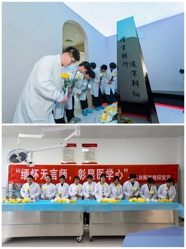緬懷儀式結束后,在黨委書記花明帶領下,師生代表走進該校人體生命科學館向“無言良師”紀念碑敬獻鮮花;醫(yī)學影像技術專業(yè)學生進入人體解剖學第3實驗室,向大體老師獻花,表達緬懷之情。